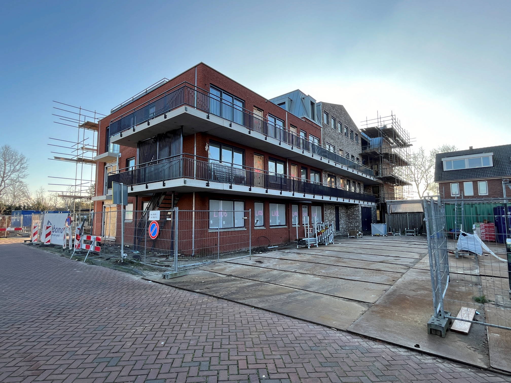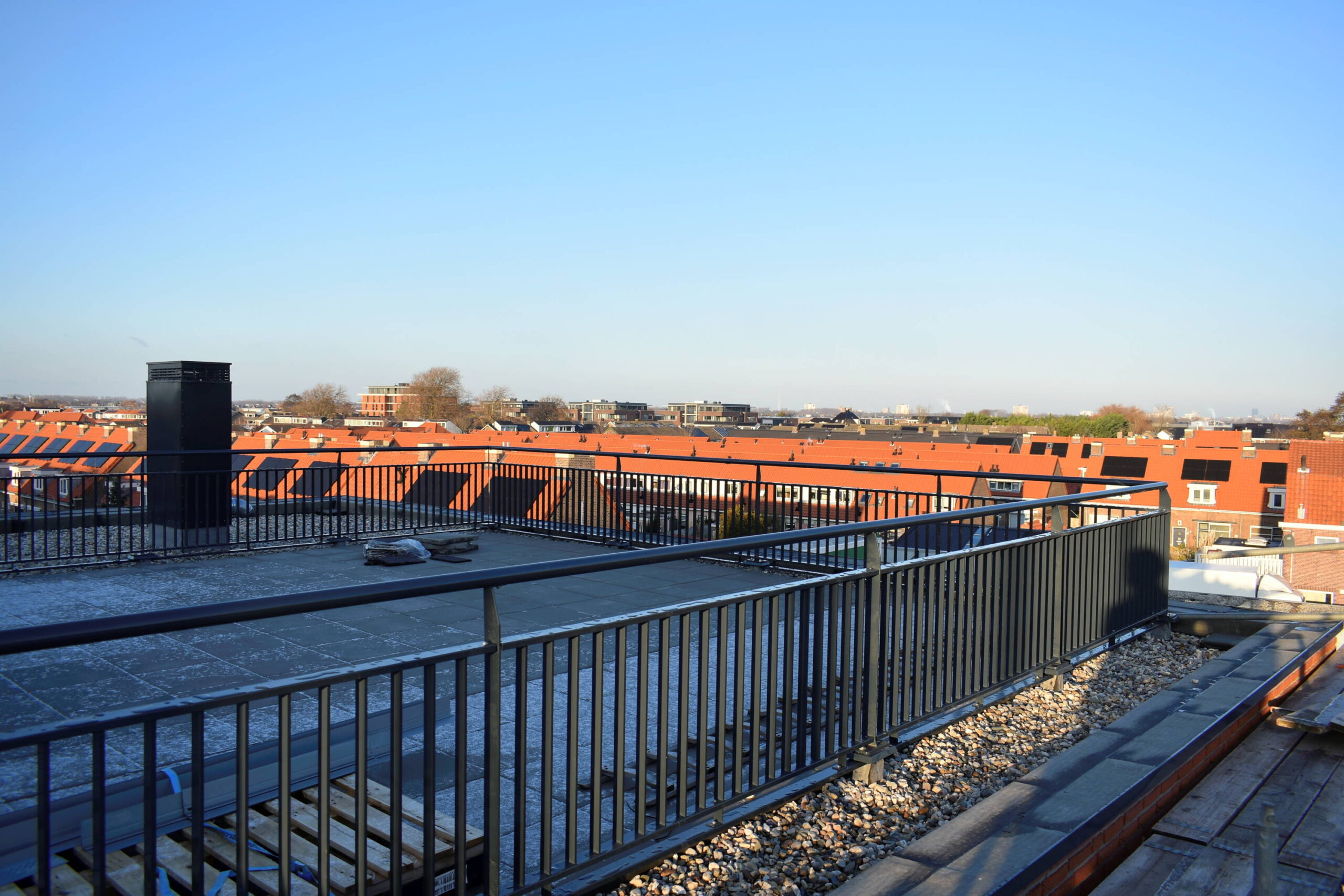 Op de begane grond en de eerste verdieping is het spuitwerk aan het plafond voltooid, zie foto's. Het hekwerk langs de galerijen is voltooid en het hek op het dakterras van Penthouse 1 is geplaatst.