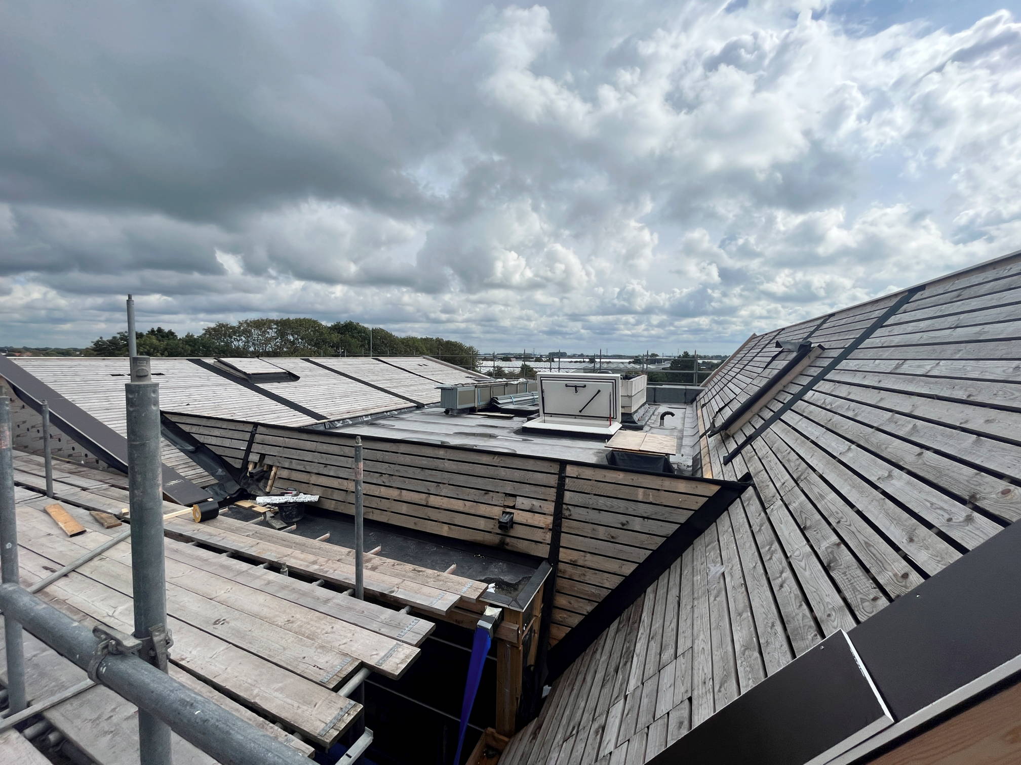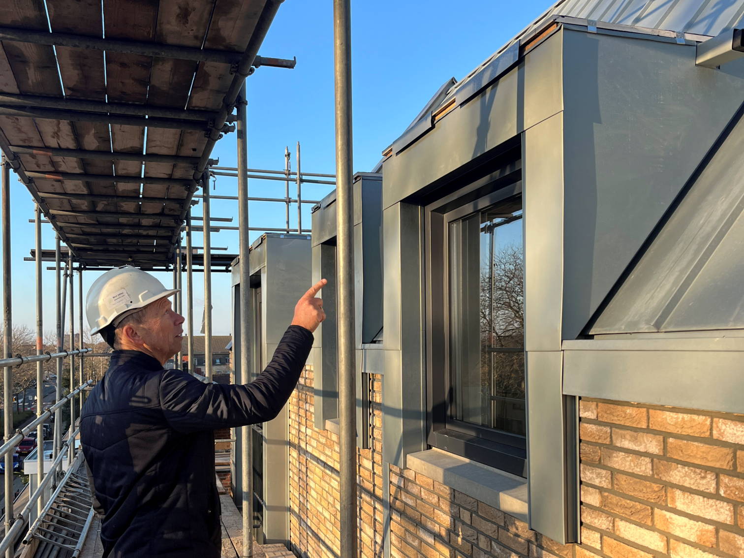 De bouwvakkers zijn druk bezig om het zinken dak te plaatsen en te monteren.